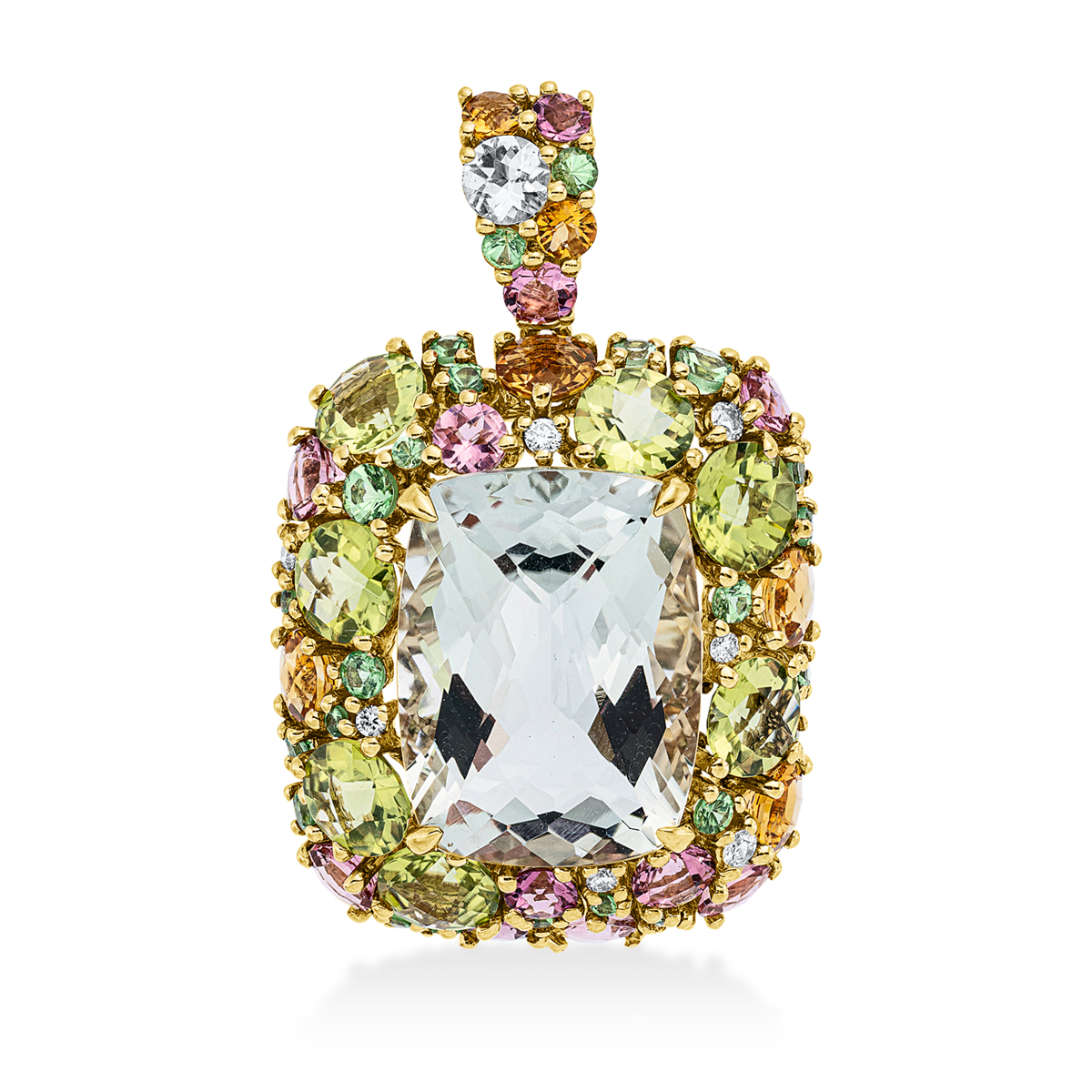 Anhänger 18 kt GG, mit Öse, 8 Brillanten 0,13 ct, TW-si, 1 Amethyst 10,70 ct grün, 49 Farbsteine 7,42 ct multicolor