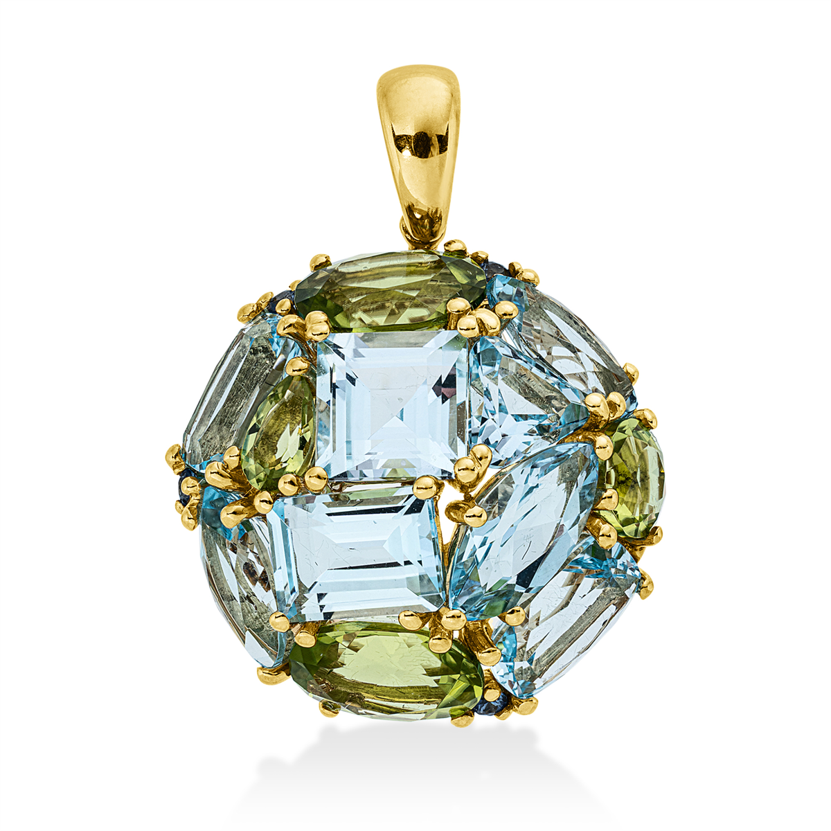 Anhänger 18 kt GG, mit Öse, 4 Peridot 3,70 ct grün, 8 Topase 8,80 ct sky blue