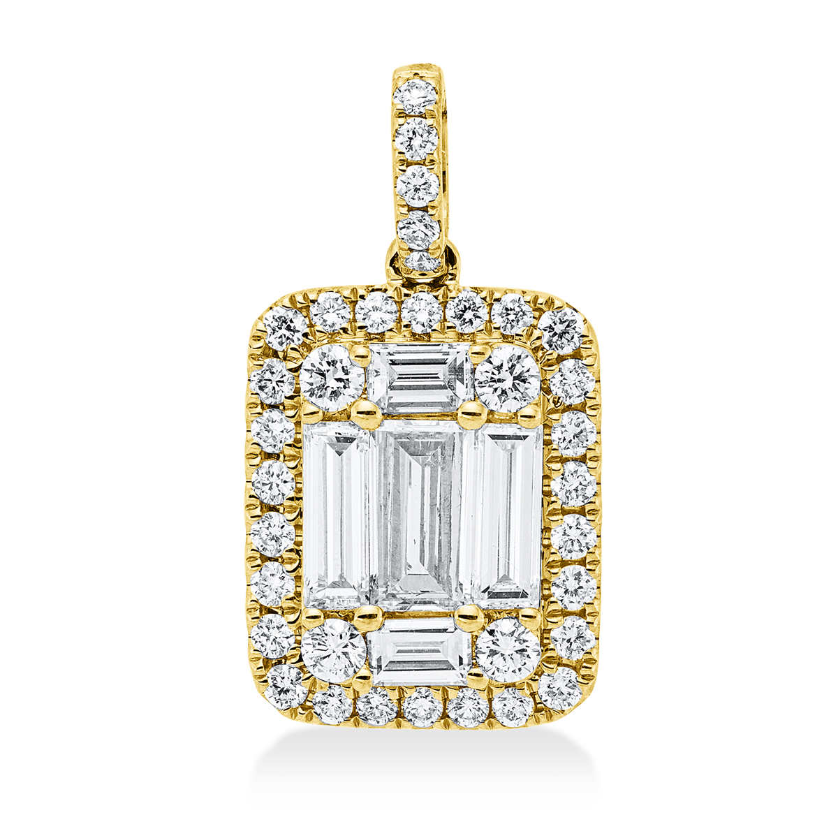 Anhänger 18 kt GG, mit Öse, 4 Brillanten 0,12 ct, TW-si, 4 Baguette 0,54 ct, TW-si, 1 Bag. 0,36 ct, TW-si, 31 Brillanten 0,29 ct, TW-si