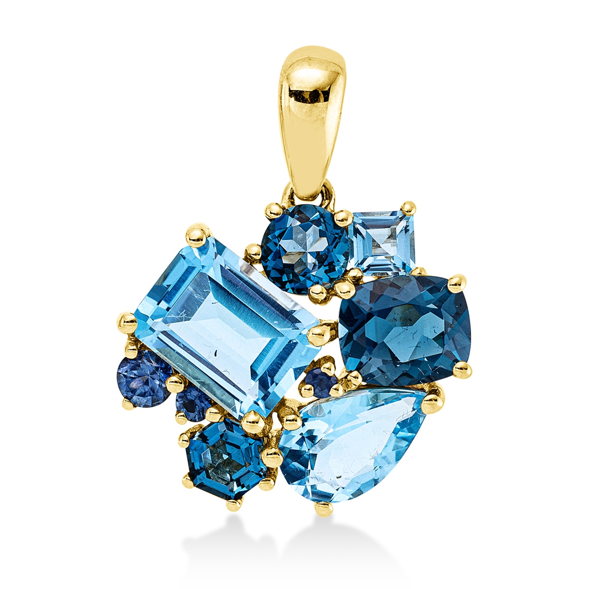 Anhänger 18 kt GG, mit Öse, 3 Topase 1,60 ct Lond. blue, 3 Topase 3,00 ct blau, 3 Saphire 0,19 ct blau, H:21,2 mm, B:16,5 mm, S:5,9 mm