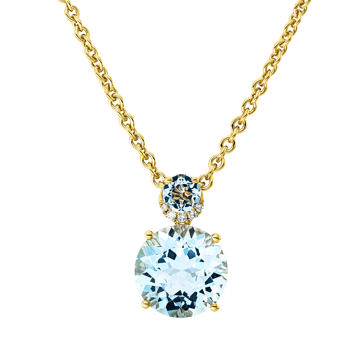 Anhänger 18 kt GG, mit Öse, 5 Brillanten 0,03 ct, TW-si, 1 Topas 4,30 ct sky blue, 1 Topas 0,30 ct sky blue, H:15,3 mm, B:10,0 mm, S:6,0 mm