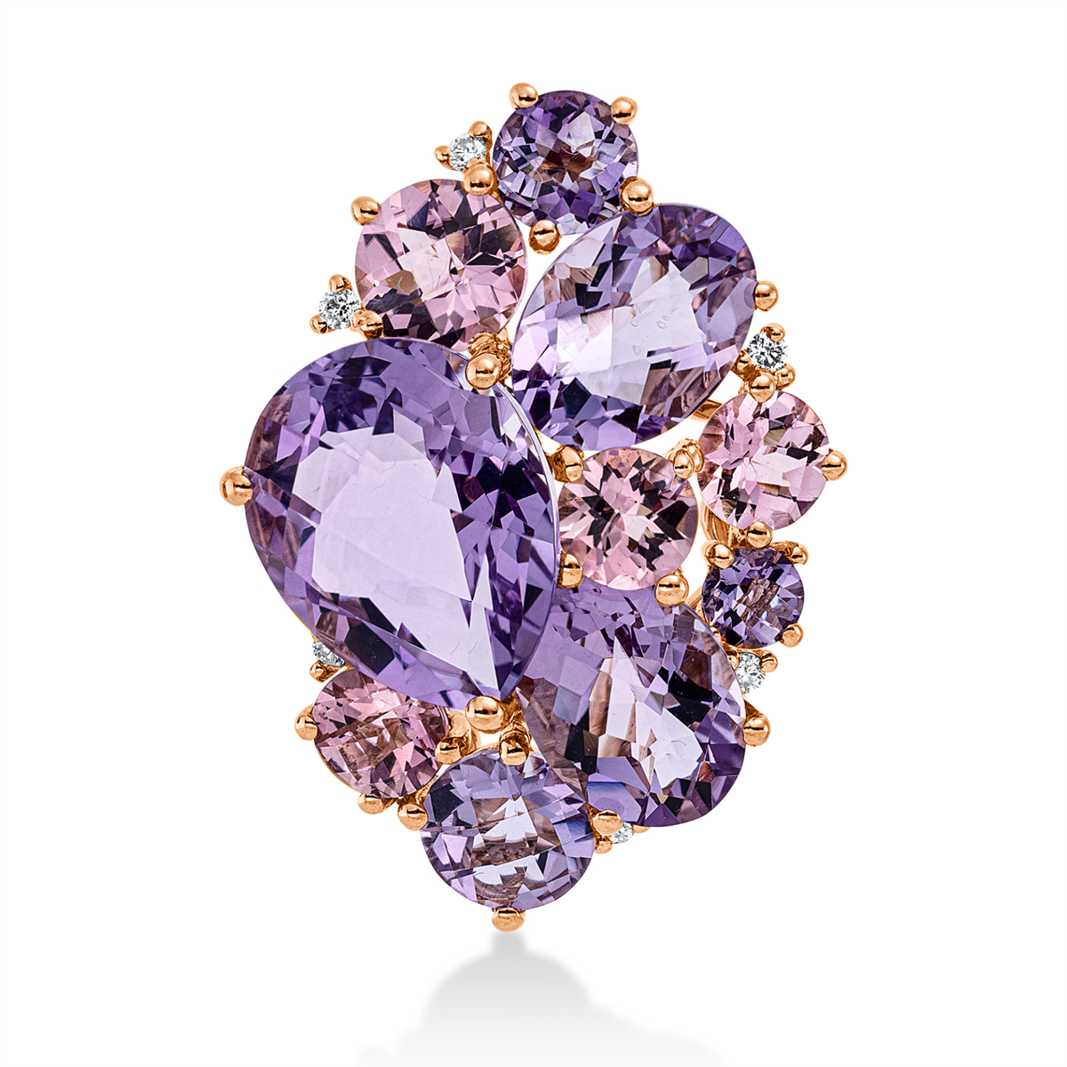 Anhänger 18 kt RG, 6 Brillanten 0,05 ct, TW-si, 6 Amethyste 6,50 ct pink, 4 Turmalin 1,50 ct pink, H:24,5 mm, B:17,8 mm, S:9,2 mm