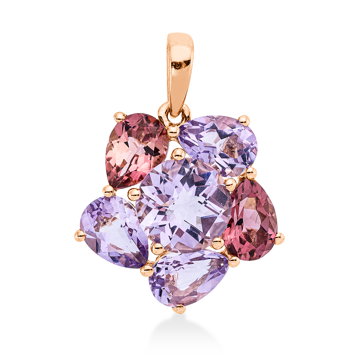 Anhänger 18 kt RG, mit Öse, 3 Amethyste 2,00 ct pink, 1 Amethyst 1,90 ct pink, 2 Turmalin 1,50 ct pink, H:20,7 mm, B:15,7 mm, S:5,1 mm