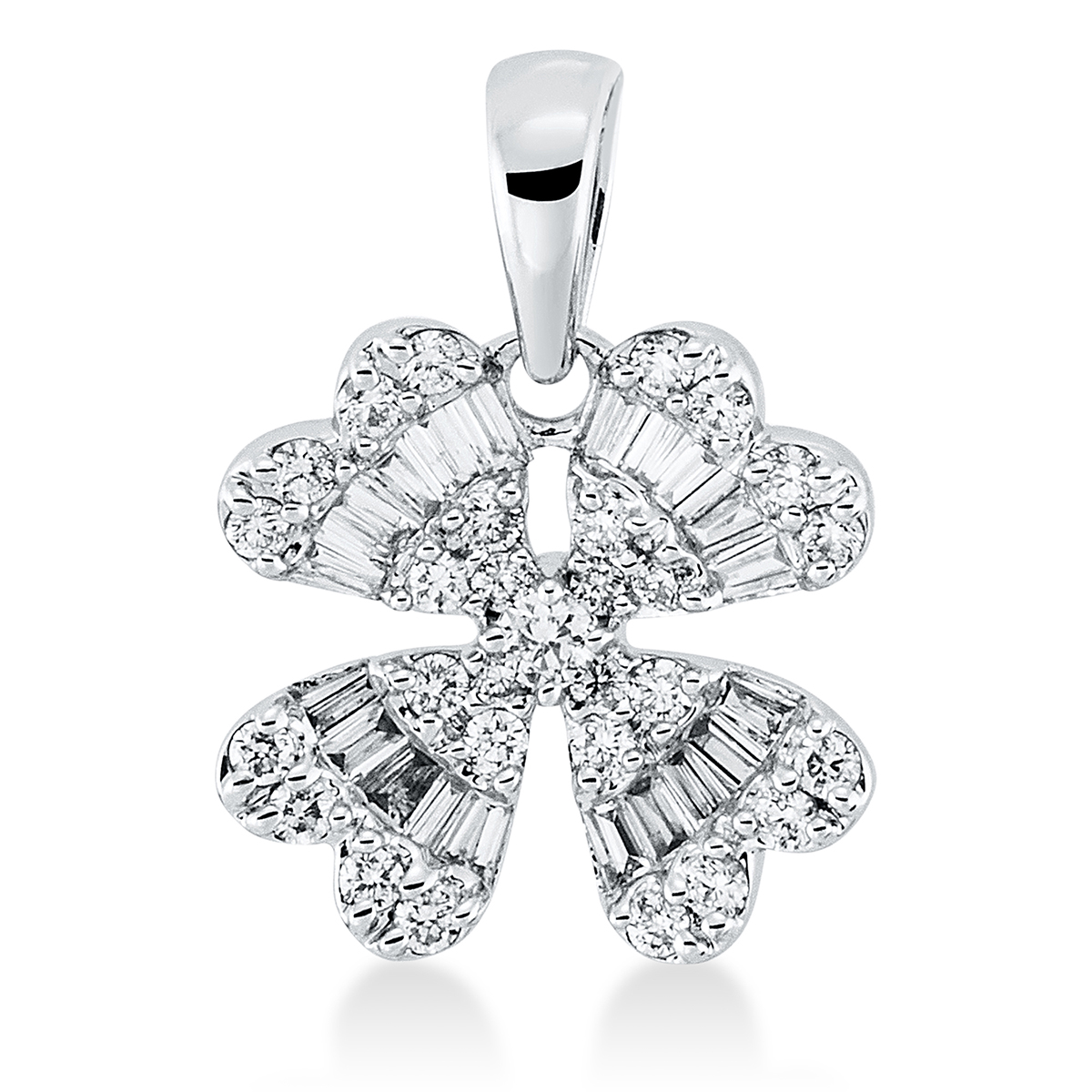 Anhänger 18 kt WG Kleeblatt, mit Öse, 28 Brillanten 0,15 ct, TW-si, 24 Trapeze 0,18 ct, TW-si, 1 Brill. 0,02 ct, TW-si, H:14,7 mm, B:10,6 mm, S:2,4 mm