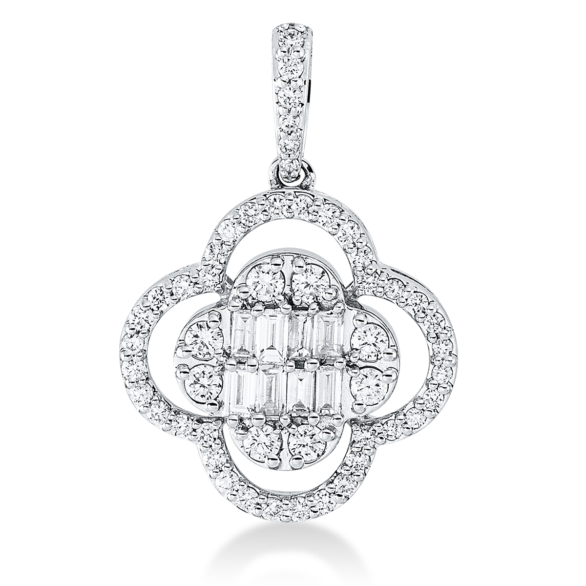 Anhänger 18 kt WG, mit Öse, 2 Brillanten 0,01 ct, TW-si, 8 Brillanten 0,14 ct, TW-si, 8 Baguette 0,12 ct, TW-si, 40 Brillanten 0,18 ct, TW-si, H:21,3 mm, B:14,6 mm, S:4,5 mm