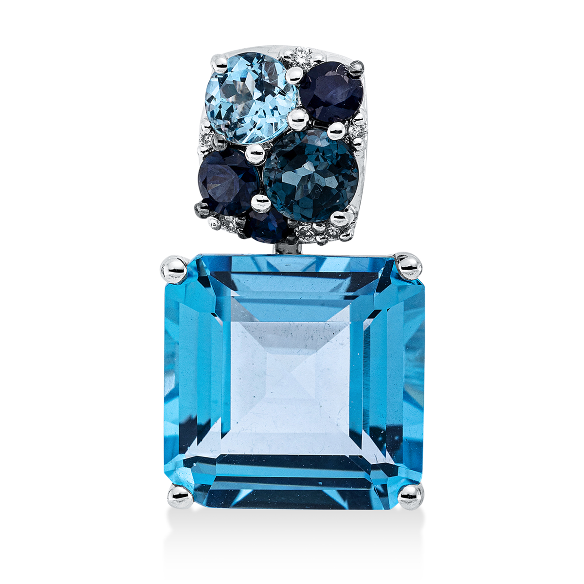 Anhänger 18 kt WG, mit Öse, 6 Brillanten 0,03 ct, TW-si, 1 Topas 0,40 ct blau, 1 Topas 8,20 ct blau, 3 Saphire 0,32 ct blau, 1 Topas 0,40 ct Lond. blue