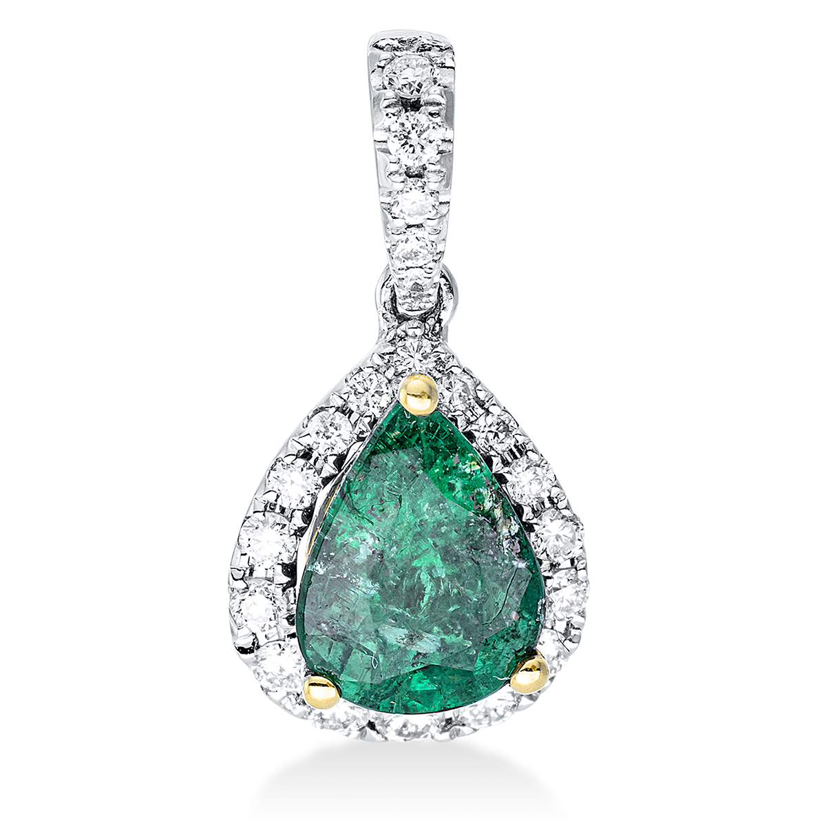 Anhänger 18 kt WG+GG, mit Öse, 18 Brillanten 0,22 ct, TW-si, 3 Brillanten 0,09 ct, TW-si, 1 Smaragd 1,19 ct grün