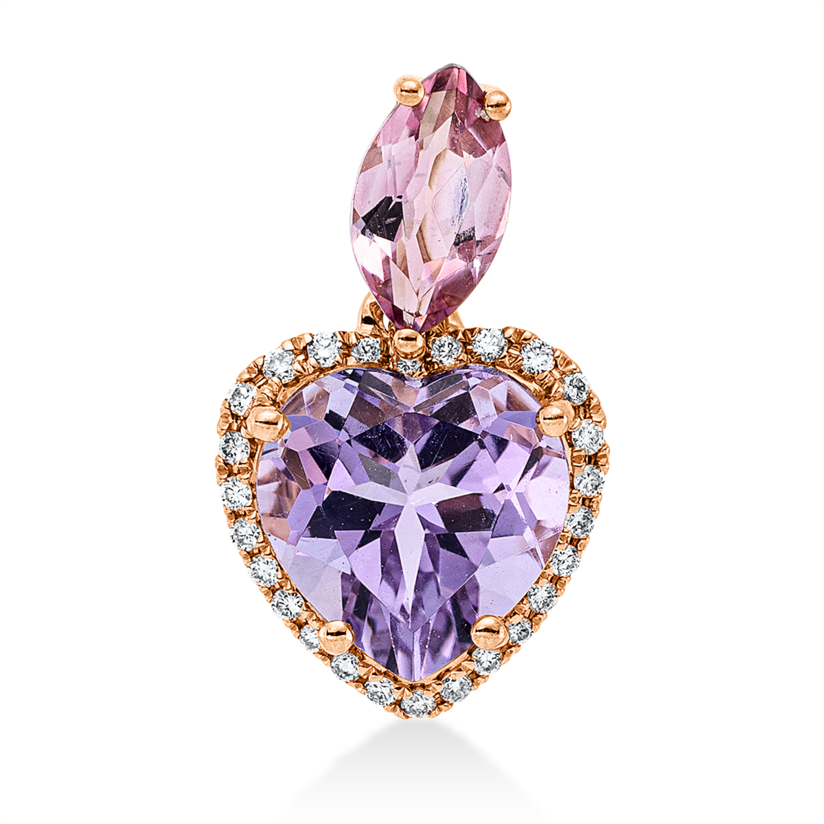 Anhänger 3er-Krappe 18 kt RG Herz, mit Öse, 26 Brillanten 0,10 ct, TW-si, 1 Amethyst 1,90 ct pink, 1 Turmalin 0,50 ct pink