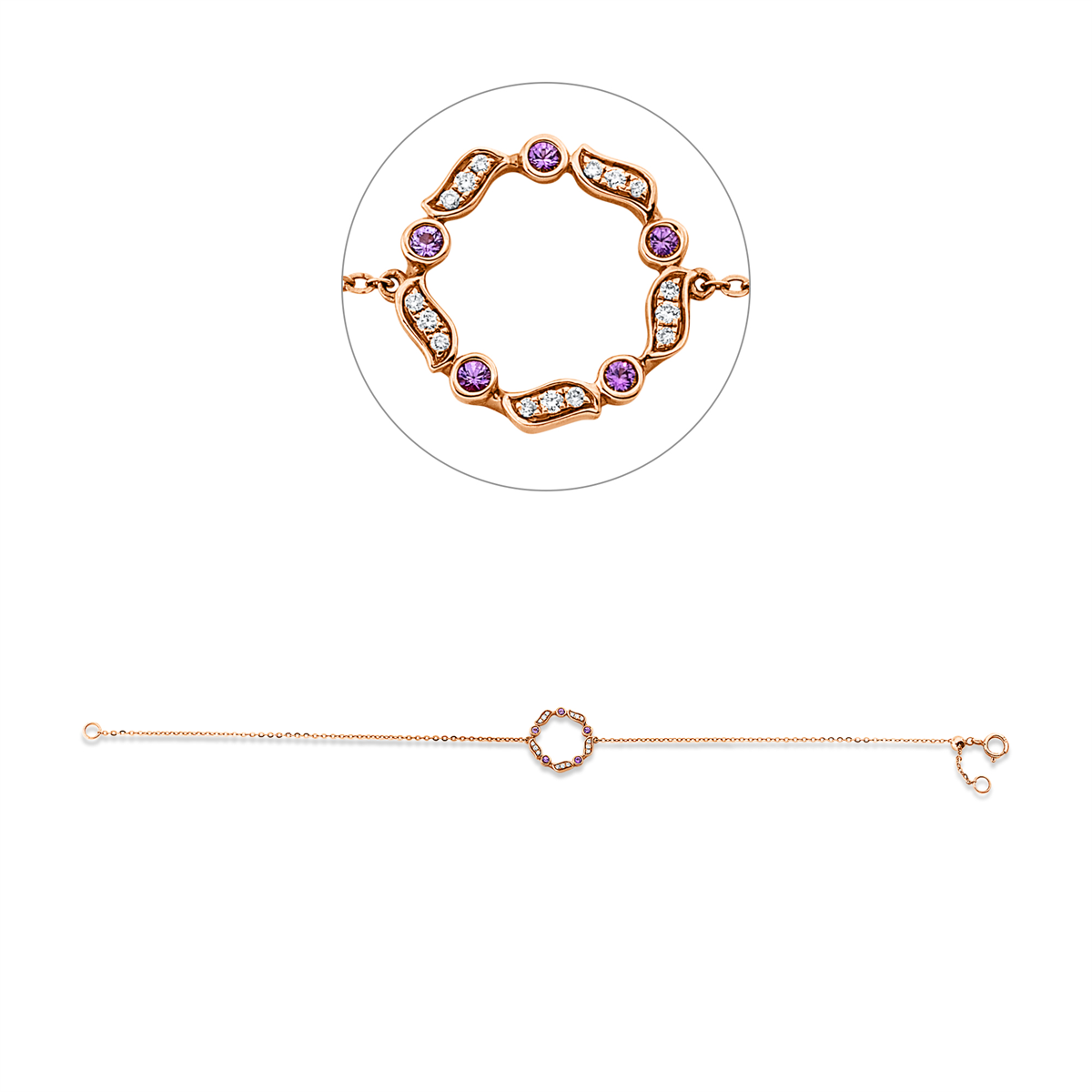 Armband 18 kt RG, 15 Brillanten 0,04 ct, TW-si, 5 Saphire 0,07 ct pink, B:12,5 mm, L:17,5 cm, S:1,4 mm