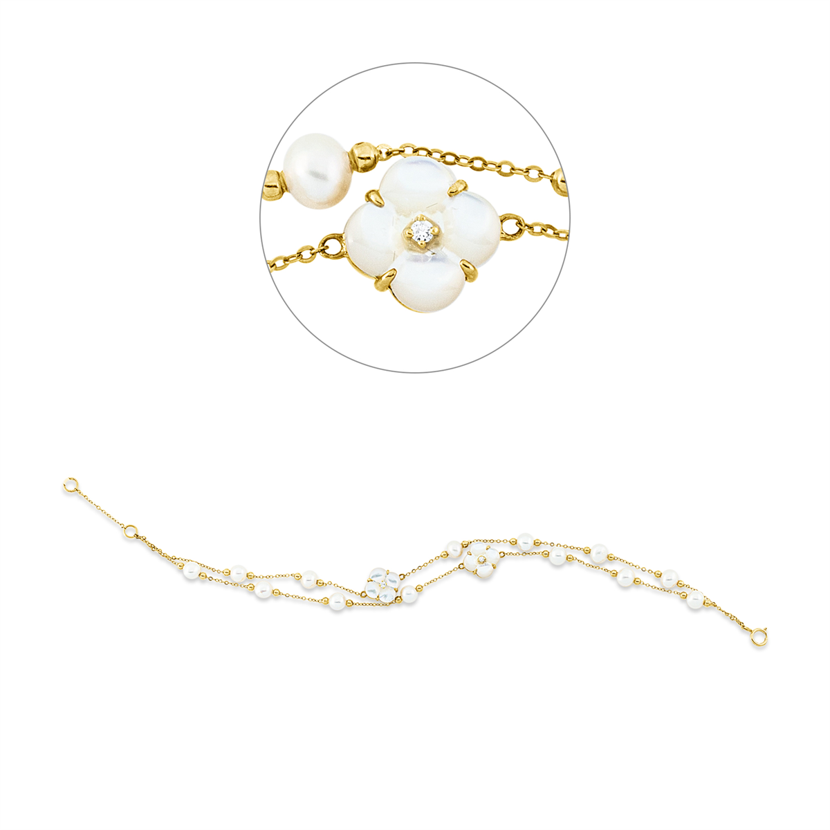 Armband 18 kt GG, mit ZÖ 19 cm, 4 Brillanten 0,06 ct, TW-si, 8 Perlmutt weiß, 13 SW weiß 4,5 mm, B:9,7 mm, L:21,0 cm, S:5,9 mm