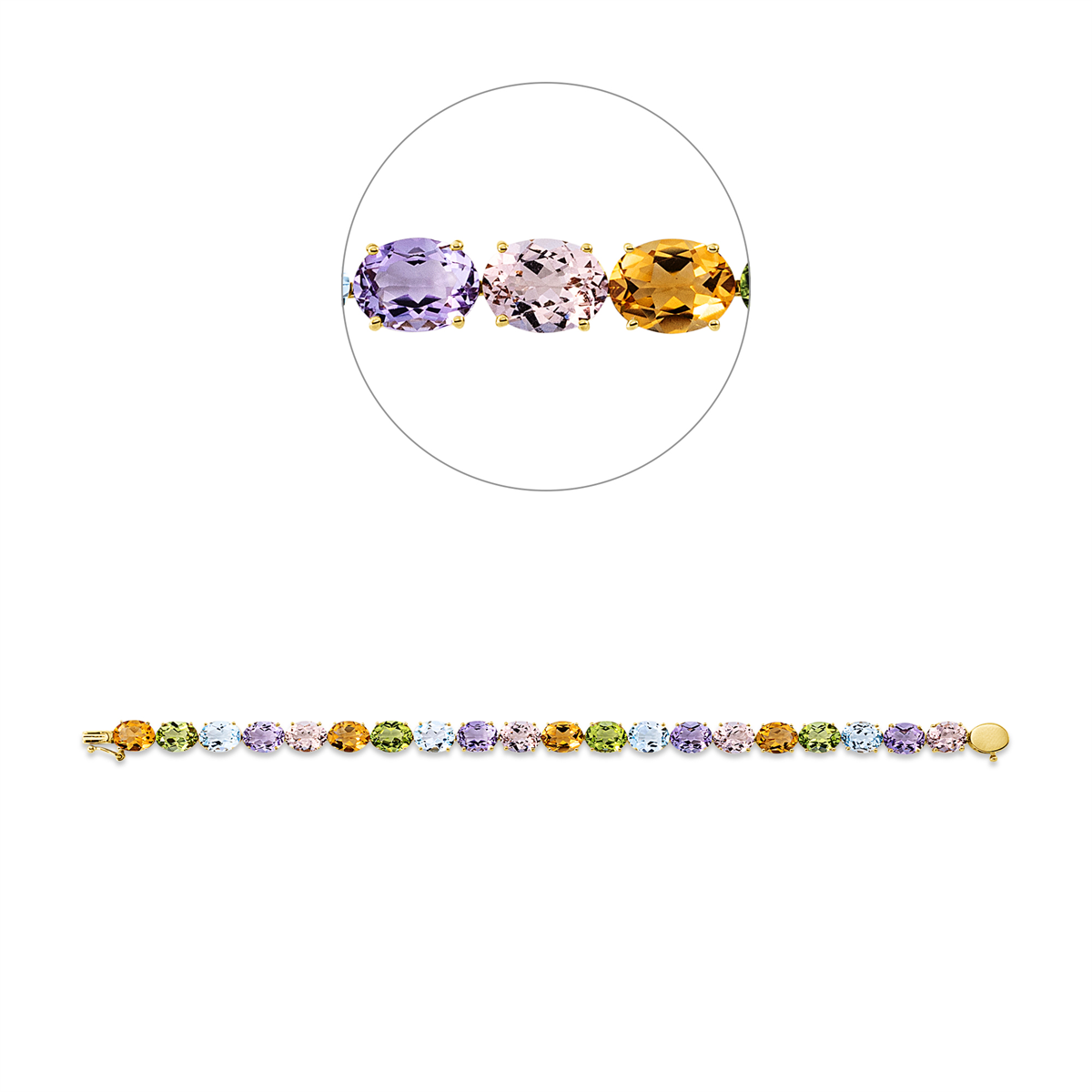 Armband 4er-Krappe 18 kt GG, 4 Morganit 5,00 ct rosé, 4 Amethyste 4,60 ct pink, 4 Topase 6,10 ct sky blue, 4 Peridot 5,80 ct grün, 4 Citrin 4,60 ct gelb, L:17,1 cm