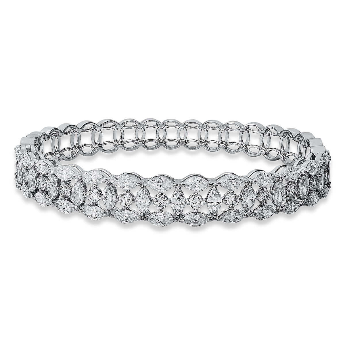 Armreif 18 kt WG, 40 Navette 5,41 ct, TW-si, 15 Brillanten 0,94 ct, TW-si, H:46,0 mm, B:56,0 mm, S:8,9 mm