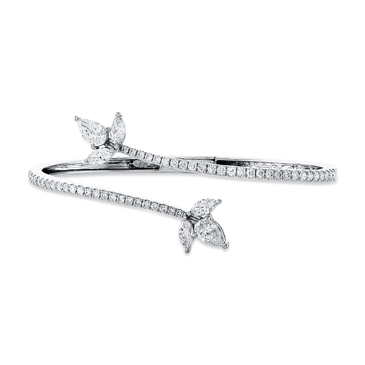Armreif 18 kt WG, 2 Tropfen 0,92 ct, TW-vsi, 4 Navette 0,67 ct, TW-vsi, 54 Brillanten 1,11 ct, TW-vsi, H:46,0 mm, B:56,0 mm