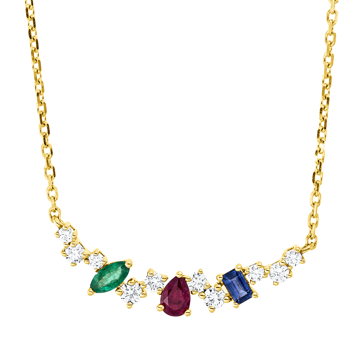 Collier 18 kt GG, mit ZÖ 40 cm, 10 Brillanten 0,18 ct, TW-si, 1 Rubin 0,14 ct rot, 1 Smaragd 0,08 ct grün, 1 Saphir 0,08 ct blau, L:45,0 cm