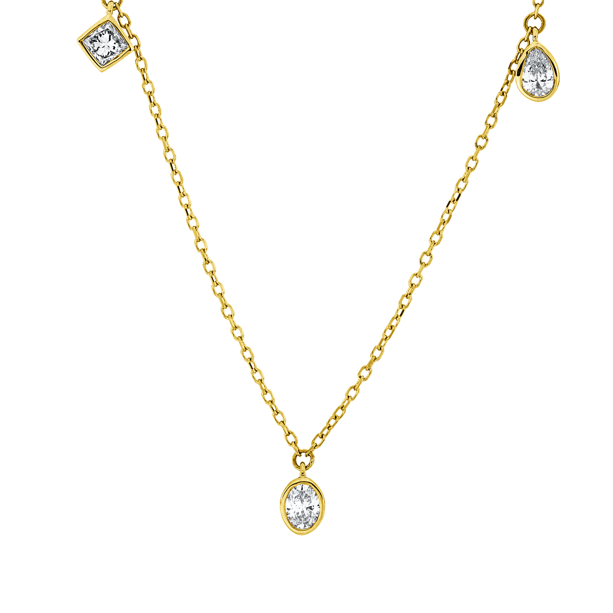 Collier 18 kt GG, mit ZÖ 43 cm + 40,6 cm, 1 Tropfen 0,09 ct, TW-si, 1 Oval 0,11 ct, TW-si, 1 Navette 0,10 ct, TW-si, 1 Sm.schliff 0,11 ct, TW-si, 1 Princ. 0,11 ct, TW-si, H:5,7 mm, B:4,2 mm, L:45,7 cm, S:2,0 mm