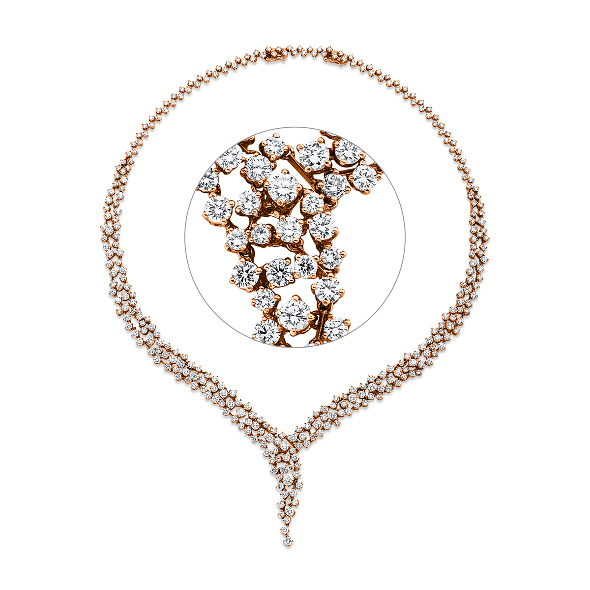 Collier 18 kt RG, extension ZÖ 40,5 cm, 123 Brillanten 10,81 ct, TW-vsi, 194 Brillanten 8,61 ct, TW-vsi, H:45,3 mm, B:11,8 mm, L:43,0 cm, S:4,2 mm