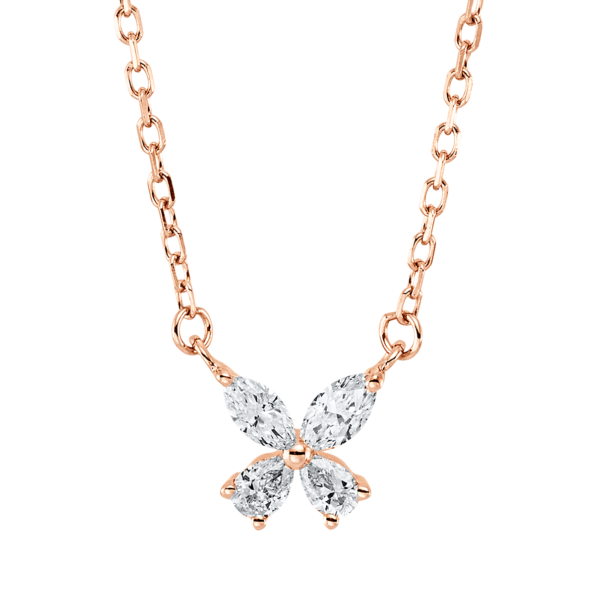 Collier 18 kt RG, mit ZÖ 40 cm, 2 Tropfen 0,07 ct, TW-vsi, 2 Navette 0,10 ct, TW-vsi, H:5,8 mm, B:6,2 mm, L:45,7 cm, S:3,0 mm