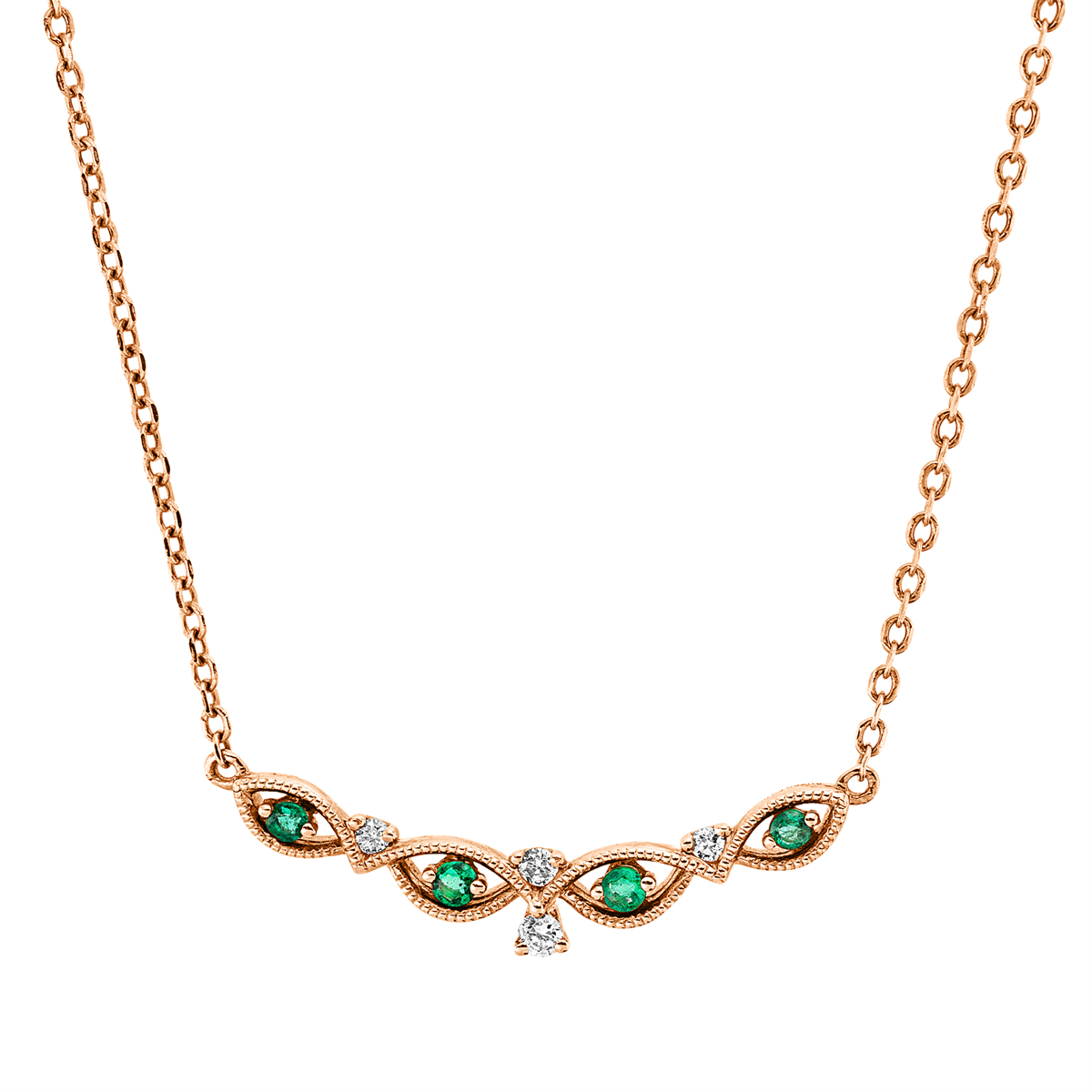 Collier 18 kt RG, mit ZÖ 42+43+44cm, 4 Brillanten 0,05 ct, TW-si, 4 Smaragde 0,06 ct grün, L:45,0 cm