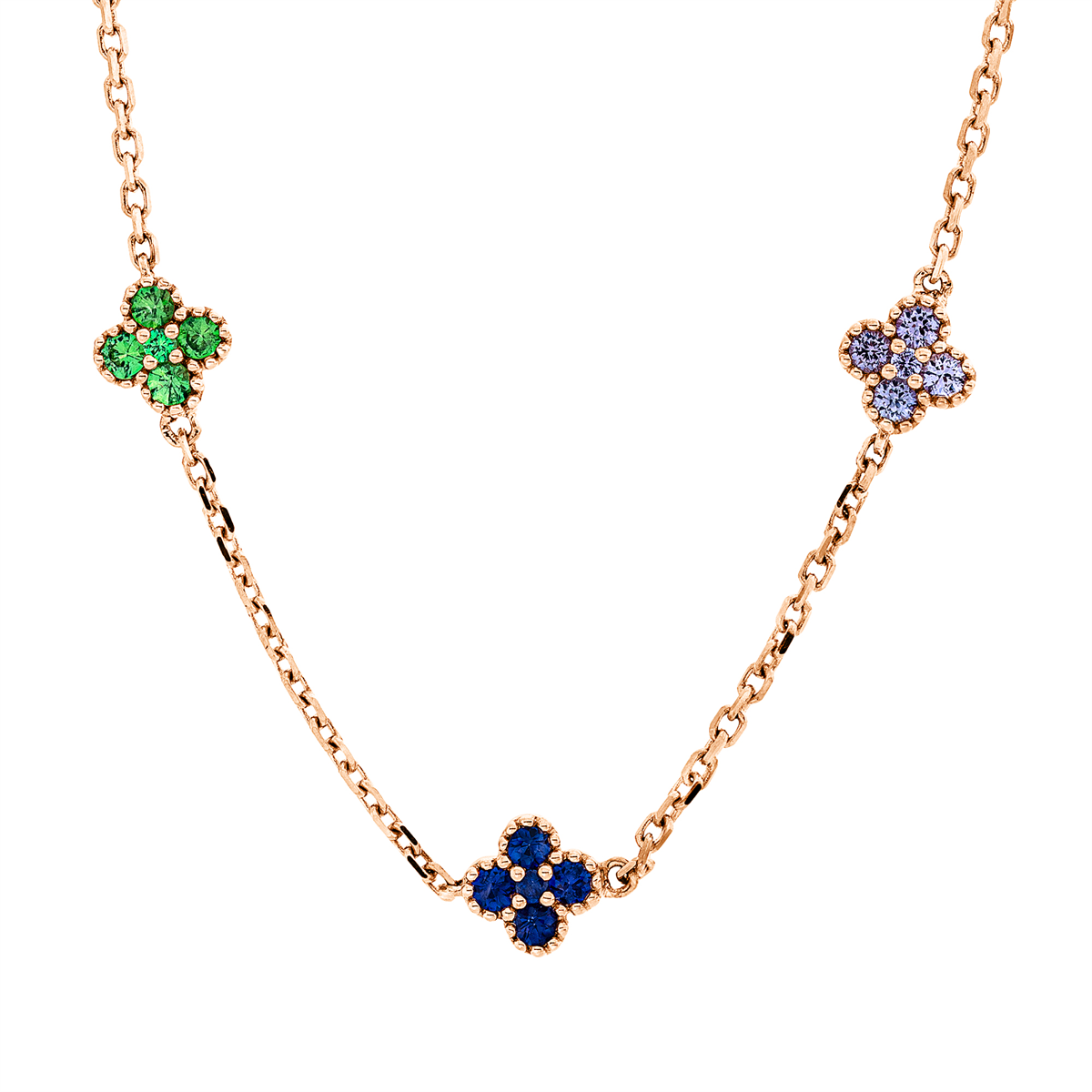 Collier 18 kt RG, mit ZÖ 43 cm + 44 cm, 35 Saphire 0,89 ct fancy, H:5,2 mm, B:5,2 mm, L:45,0 cm, S:1,5 mm