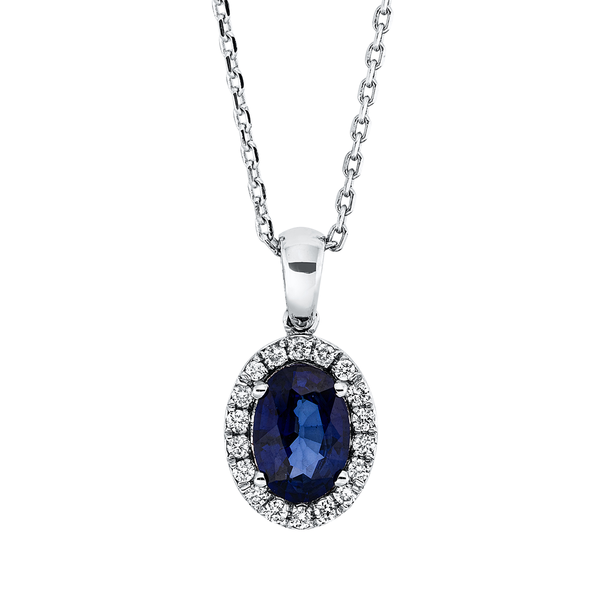 Collier 18 kt WG, 18 Brillanten 0,12 ct, F-si, 1 Saphir 0,86 ct blau, H:15,1 mm, B:7,7 mm, L:45,0 cm, S:4,6 mm