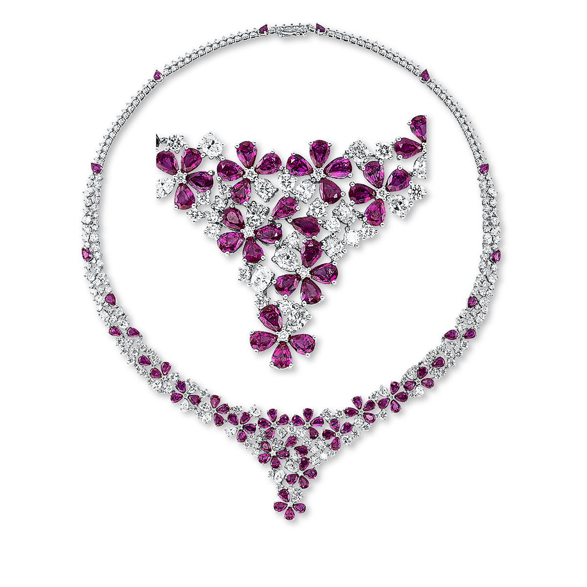 Collier 18 kt WG, 39 Oval 5,84 ct, TW-si, 255 Brillanten 9,19 ct, TW-si, 65 Rubine 19,62 ct rot, H:36,6 mm, L:42,0 cm
