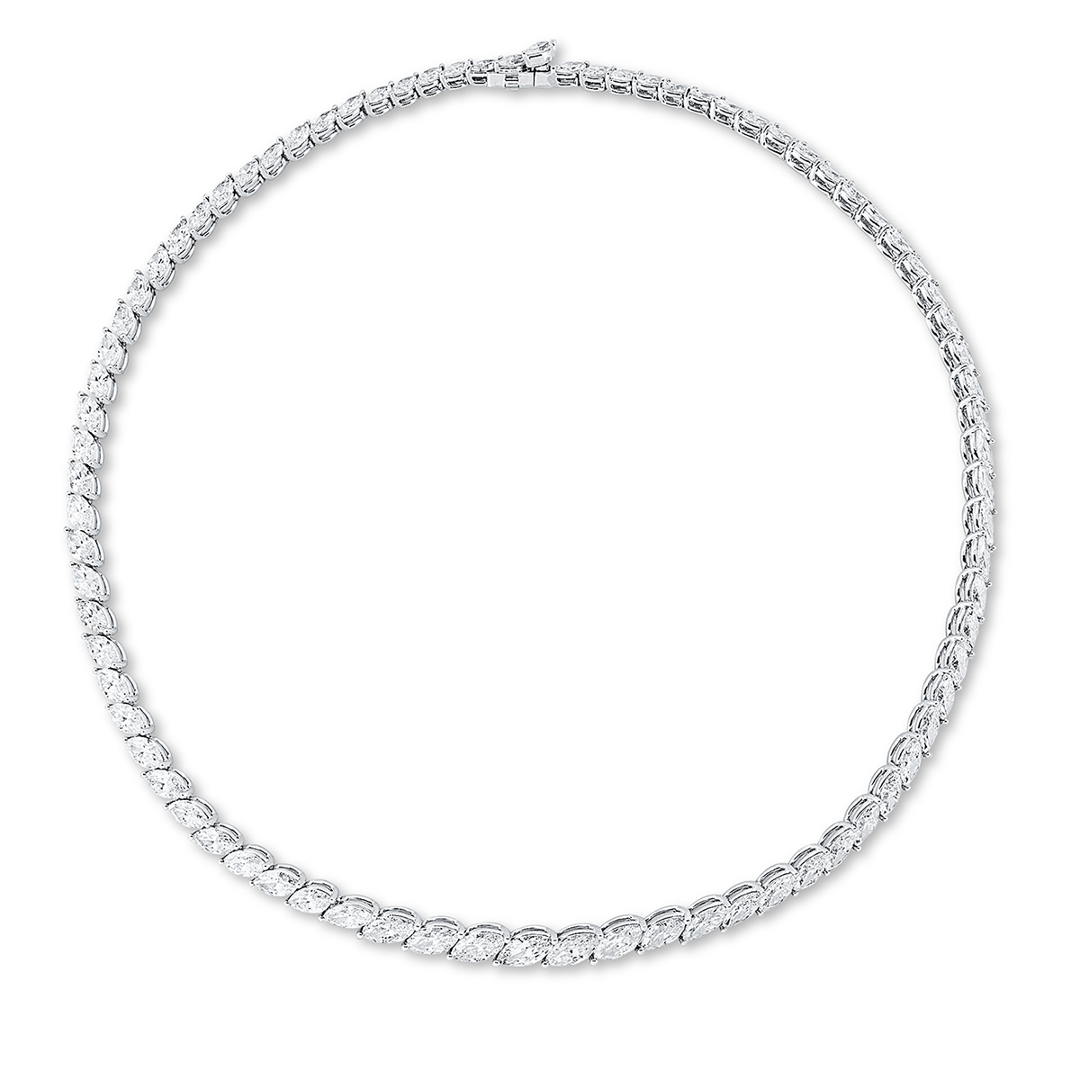 Collier 18 kt WG, 35 Navette 13,15 ct, TW-si, 24 Navette 11,73 ct, TW-si, 7 Navette 5,40 ct, TW-si, 16 Navette 3,81 ct, TW-si, L:44,0 cm