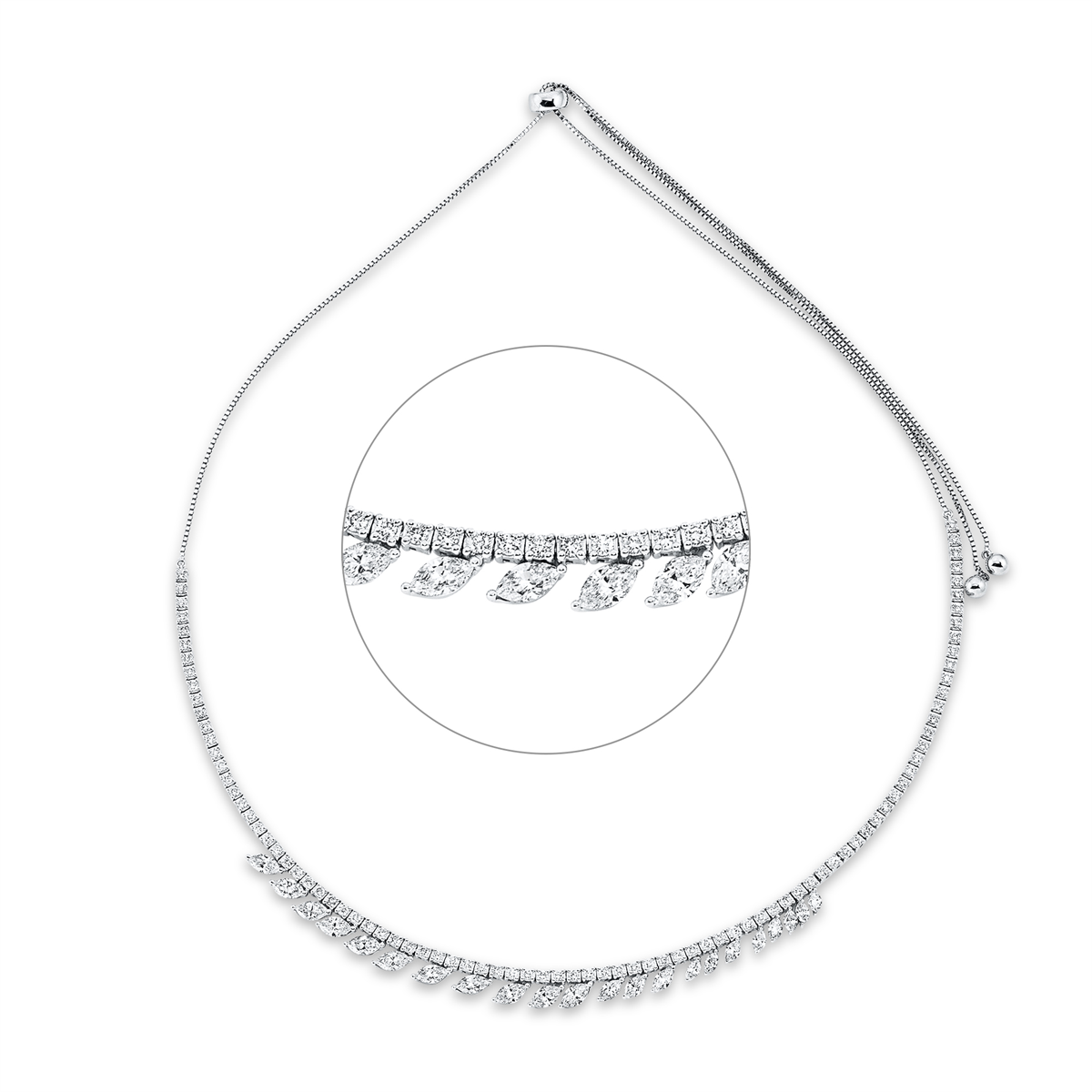 Collier 18 kt WG, 22 Navette 3,75 ct, TW-vsi, 89 Brillanten 1,96 ct, TW-si, L:68,5 cm
