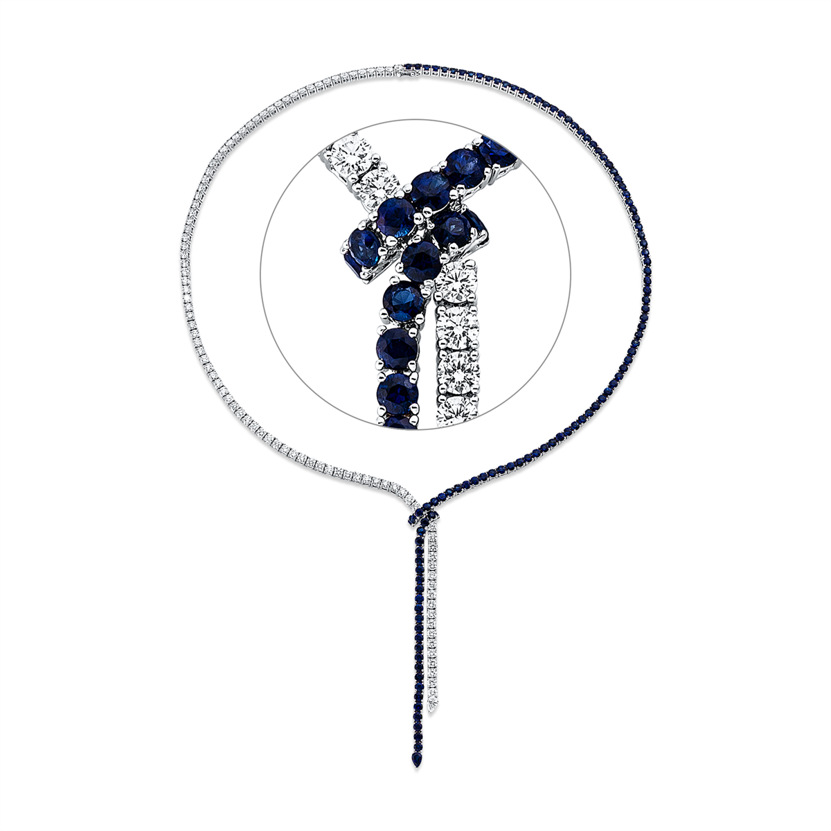 Collier 18 kt WG, 1 Tropfen 0,16 ct, F-vsi, 94 Brillanten 7,57 ct, F-vsi, 107 Saphire 11,53 ct blau, H:80,3 mm, B:10,0 mm, L:45,7 cm, S:4,8 mm