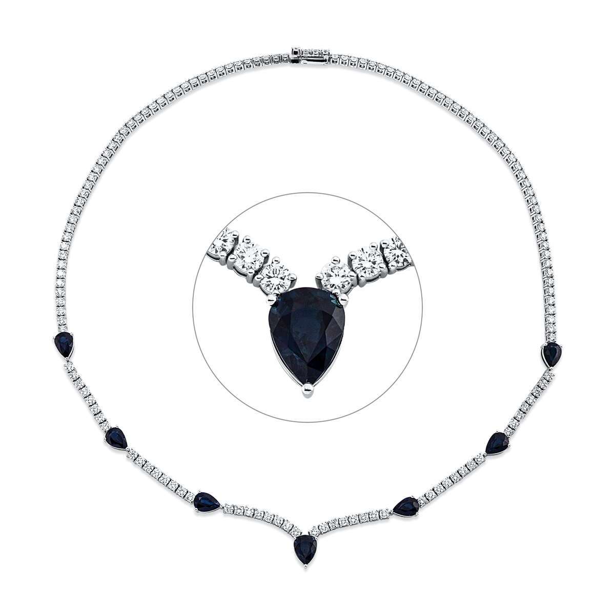 Collier 18 kt WG, 138 Brillanten 7,17 ct, TW-si, 1 Saphir 1,33 ct blau, 6 Saphire 5,11 ct blau, H:9,2 mm, B:6,3 mm, L:40,6 cm, S:4,3 mm