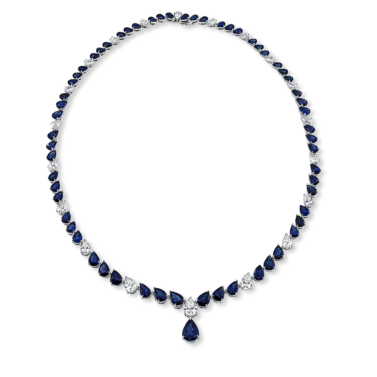 Collier 18 kt WG, 3 GIA, 17 Tropfen 4,53 ct, D-vvs/vs, 61 Saphire 30,18 ct blau, 3 Saphire 2,56 ct blau, H:21,0 mm, B:7,5 mm, L:42,0 cm, S:5,2 mm