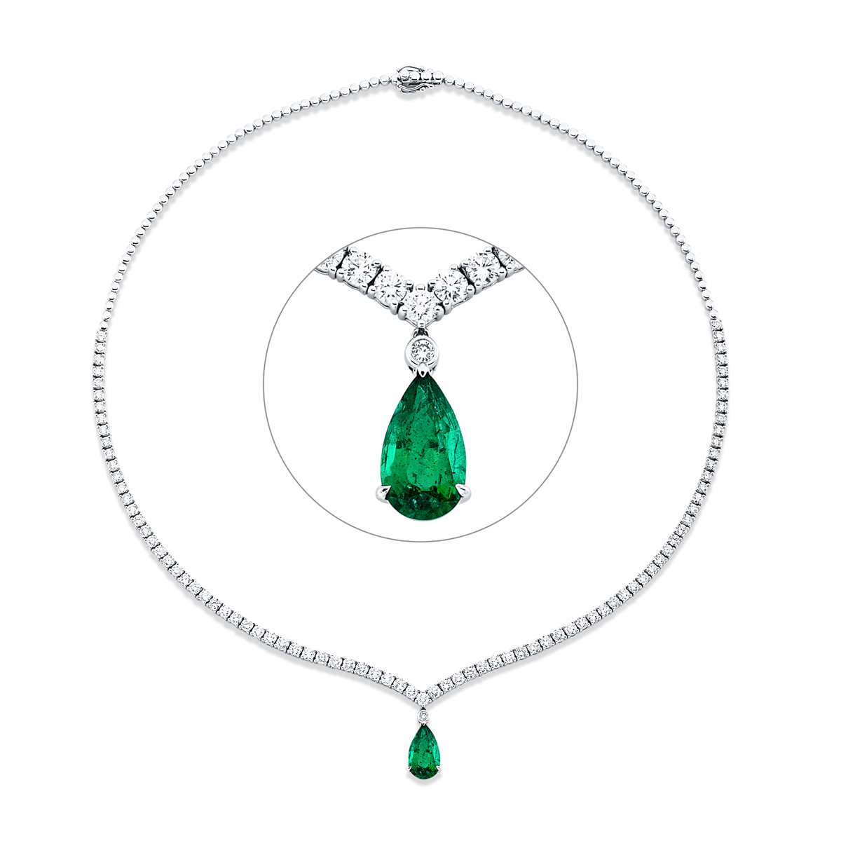 Collier 18 kt WG, 60 Brillanten 4,15 ct, TW-si, 26 Brillanten 1,15 ct, TW-si, 1 Smaragd 2,00 ct grün, H:20,5 mm, B:7,5 mm, L:43,2 cm, S:5,3 mm