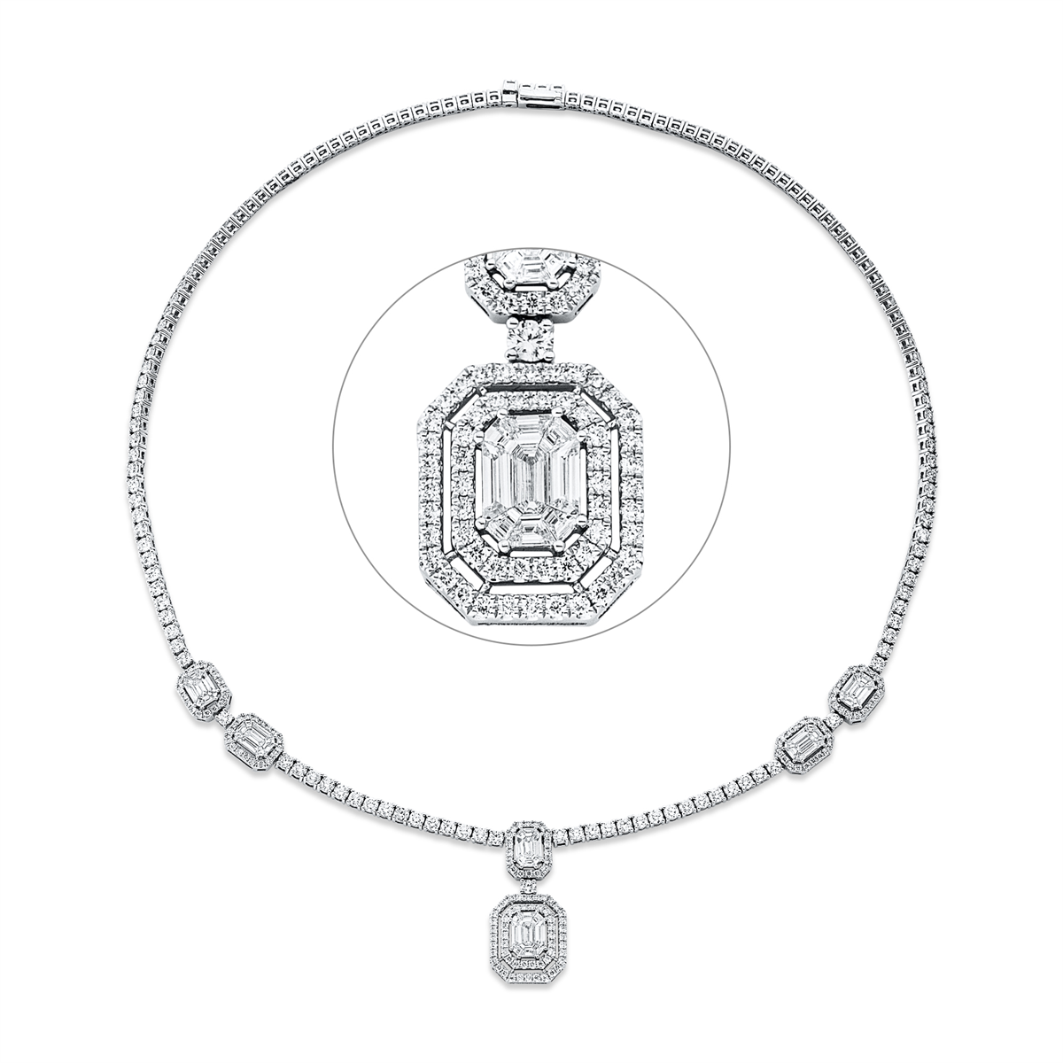 Collier 18 kt WG, 144 Brillanten 0,88 ct, TW-si, 141 Brillanten 7,11 ct, TW-si, 6 Fant-Schl. 1,38 ct, TW-vsi, H:26,5 mm, B:12,1 mm, L:40,6 cm, S:4,3 mm
