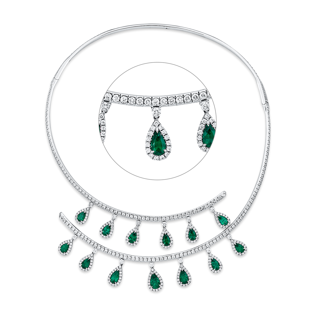 Collier 18 kt WG, IGI34J2056024, 496 Brillanten 11,10 ct, TW-si, 13 Smaragde 6,89 ct grün, L:38,1 cm