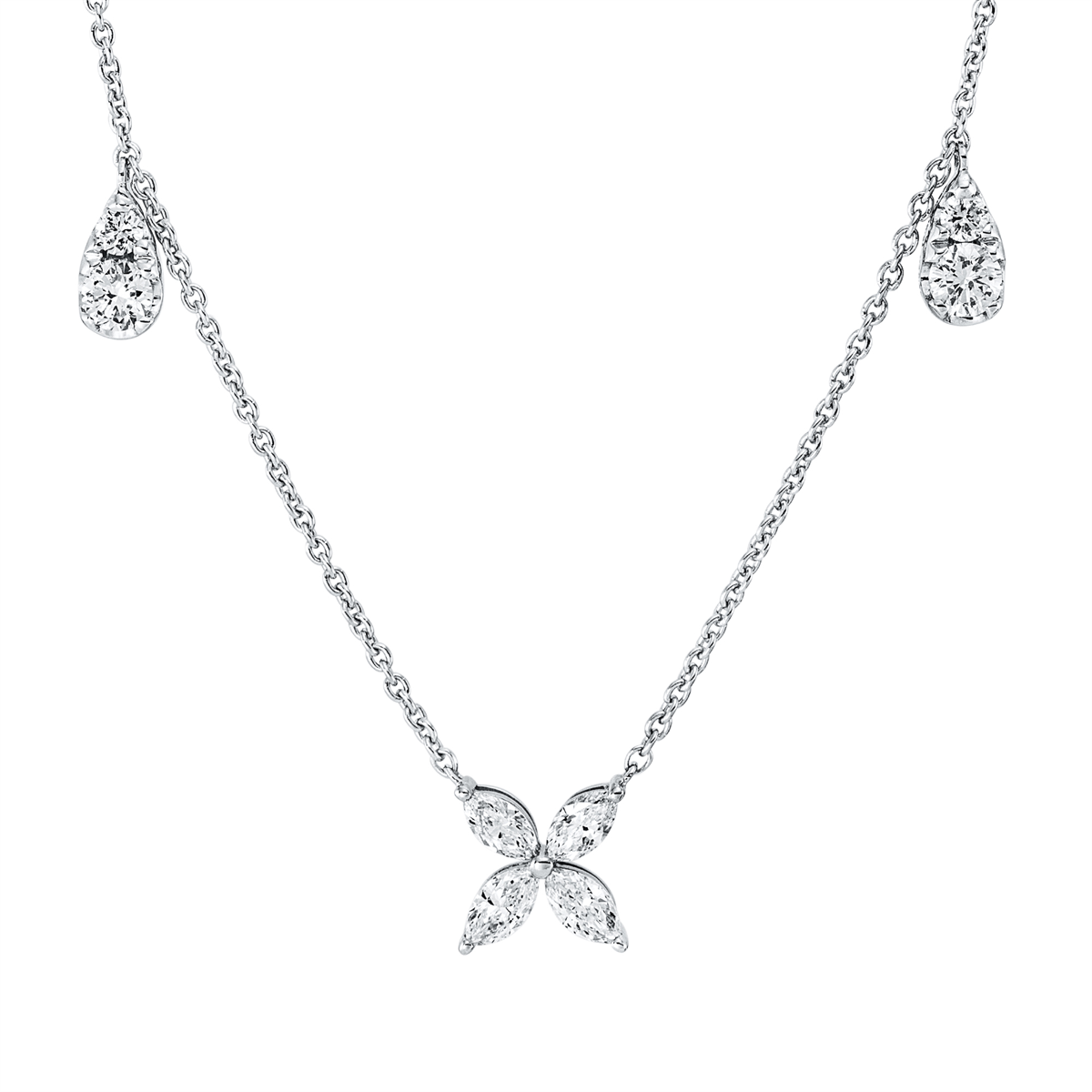 Collier 18 kt WG, mit ZÖ 40 cm + 43 cm, 2 Brillanten 0,23 ct, W-si, 12 Navette 0,63 ct, TW-si, 2 Brillanten 0,08 ct, W-si, L:45,0 cm
