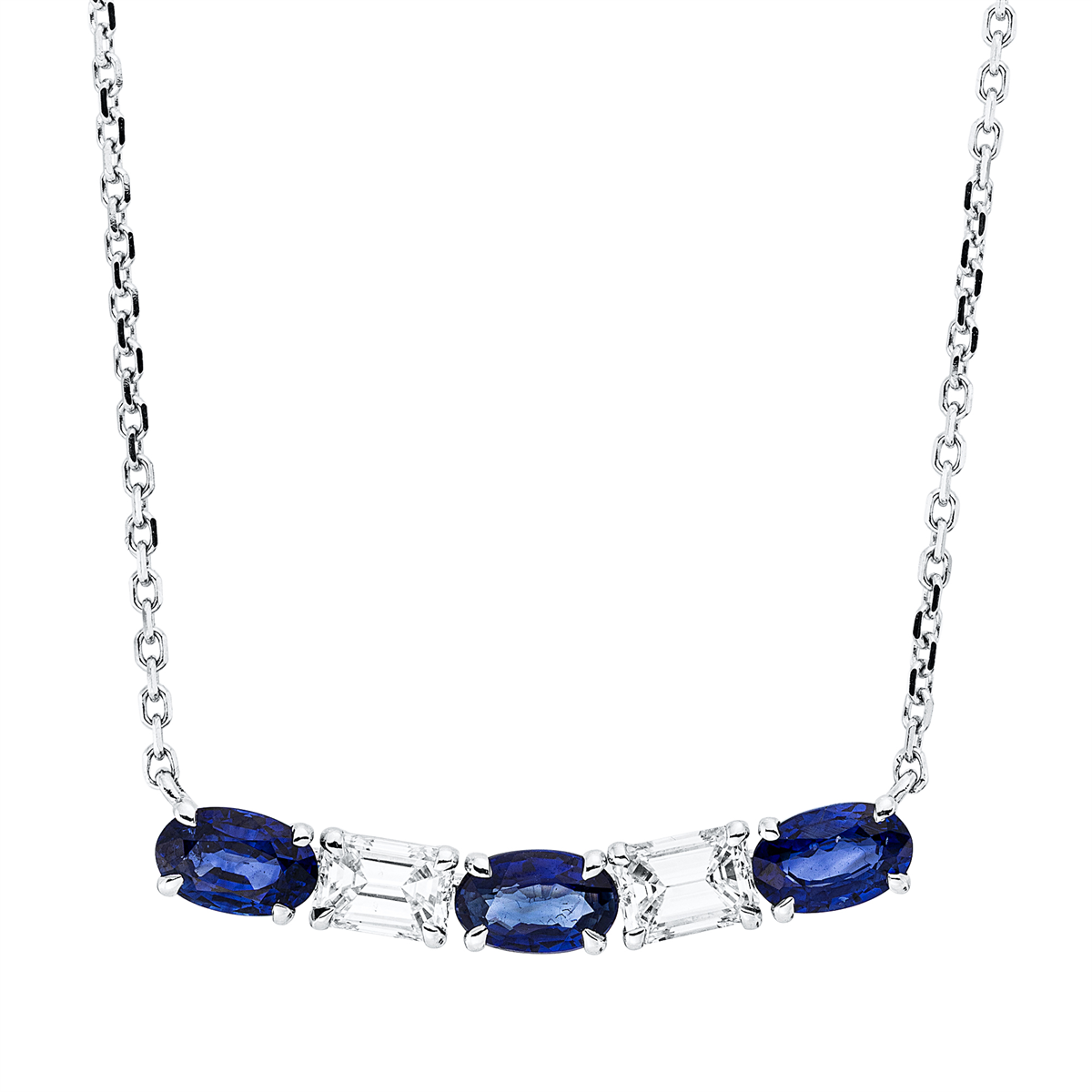 Collier 18 kt WG, mit ZÖ 40,6 cm, 2 Sm.schliff 0,50 ct, TW-si, 3 Saphire 1,08 ct blau, H:6,3 mm, B:24,0 mm, L:45,0 cm, S:3,4 mm
