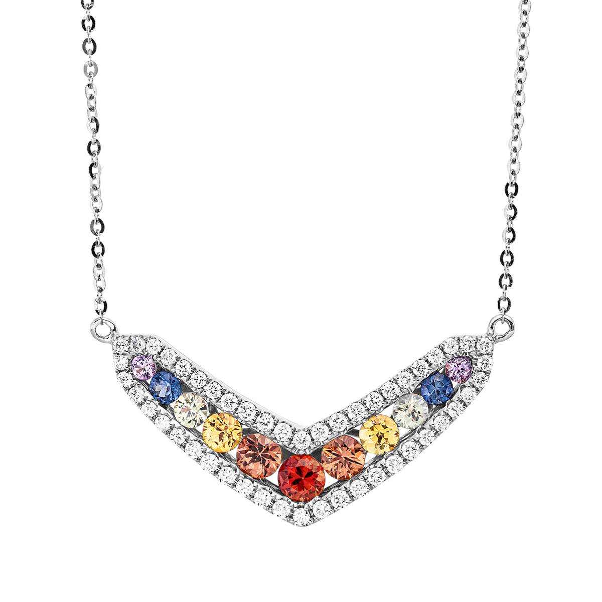 Collier 18 kt WG, mit ZÖ 40,6+43cm, 48 Brillanten 0,30 ct, TW-si, 11 Saphire 0,95 ct multicolor, L:45,7 cm