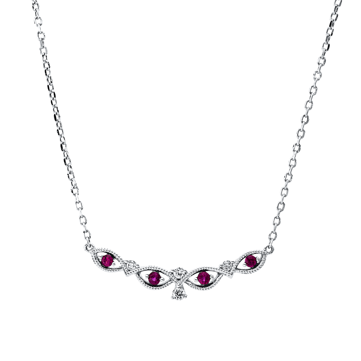 Collier 18 kt WG, mit ZÖ 42,43,44 cm, 4 Brillanten 0,05 ct, TW-si, 4 Rubine 0,07 ct rot, H:6,0 mm, B:22,6 mm, L:45,0 cm, S:1,3 mm