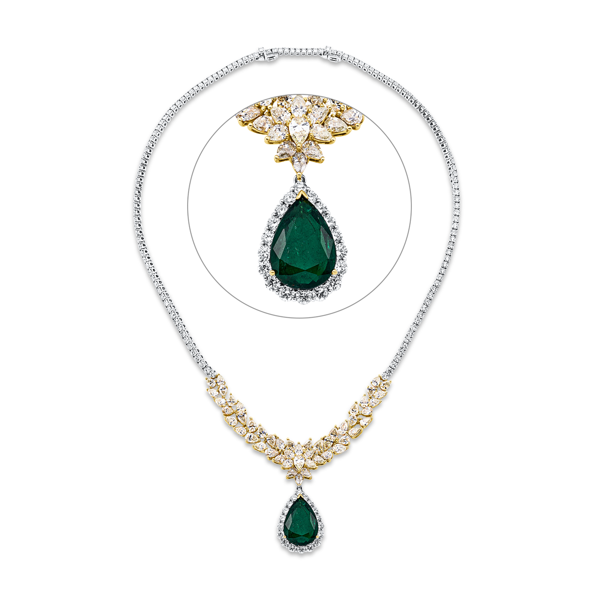 Collier 18 kt WG+GG, 155 Brillanten 9,69 ct, TW-vsi/si, 49 Tropfen 9,67 ct, gelb, 1 Smaragd 9,19 ct grün, L:41,9 cm