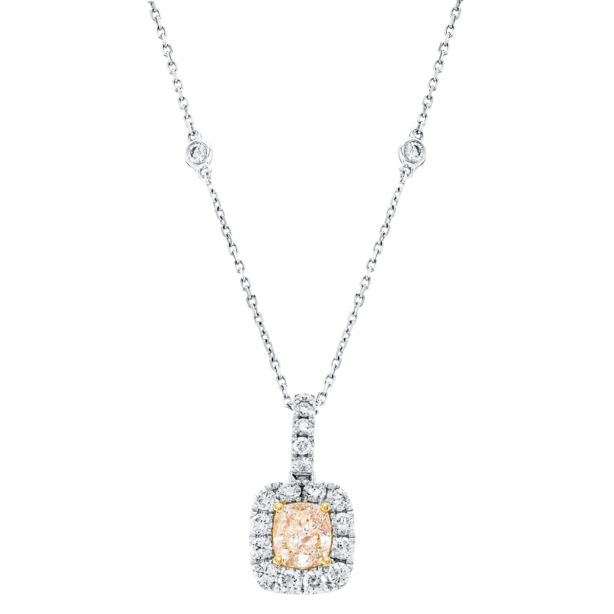 Collier 18 kt WG+GG, mit ZÖ 40 cm + 43 cm, 19 Brillanten 0,56 ct, TW-si, 1 Cushion 1,04 ct, gelb, L:45,7 cm
