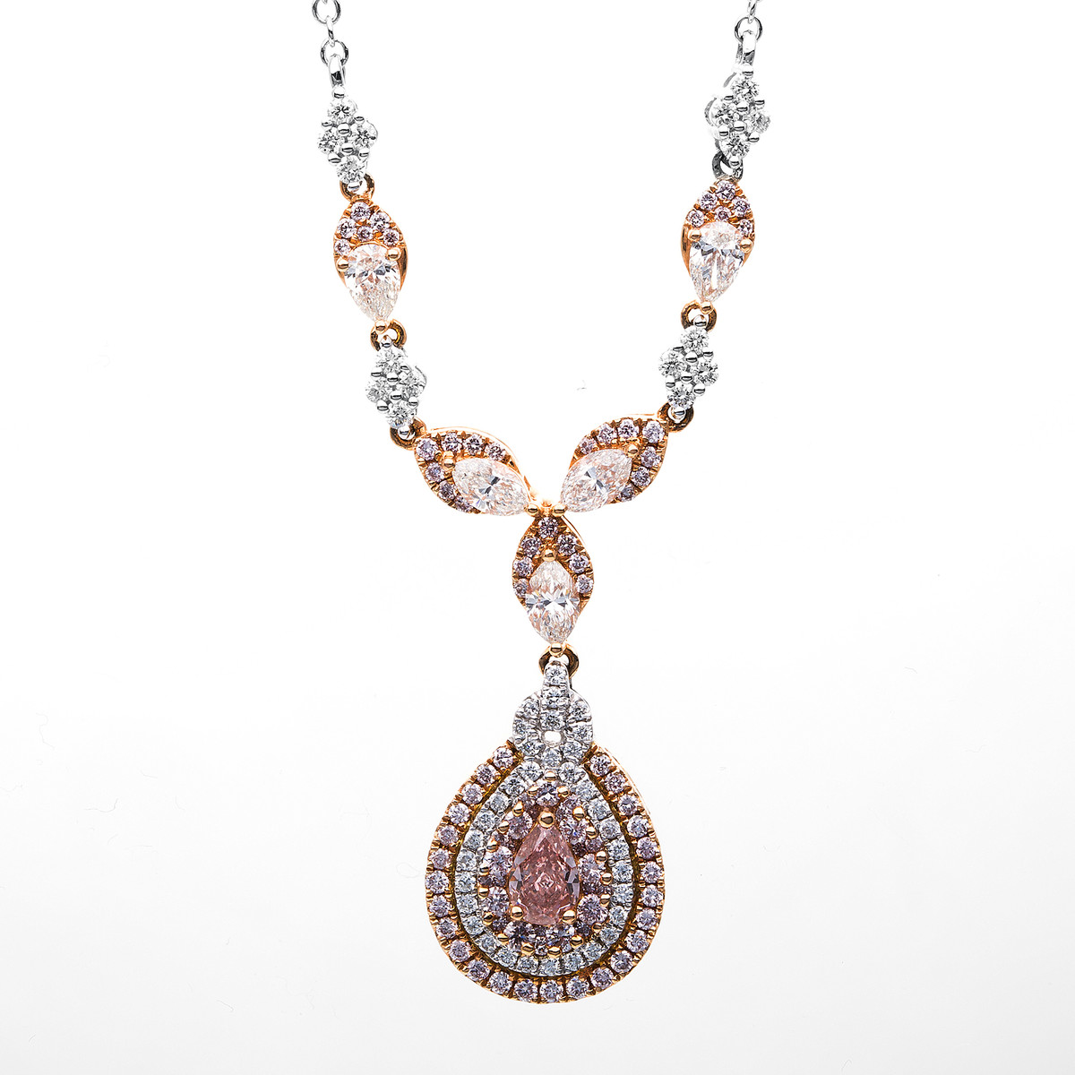 Collier 18 kt WG+RG, 3 Navette 0,47 ct, TW-vsi, 2 Tropfen 0,29 ct, TW-vsi, 54 Brillanten 0,51 ct, TW-si, 1 Tropfen 0,36 ct, pink, 88 Brillanten 0,67 ct, pink, L:40,6 cm