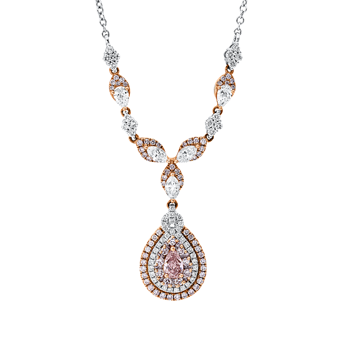 Collier 18 kt WG+RG, 3 Navette 0,47 ct, TW-vsi, 2 Tropfen 0,29 ct, TW-vsi, 54 Brillanten 0,51 ct, TW-si, 1 Tropfen 0,36 ct, pink, 88 Brillanten 0,67 ct, pink, H:30,0 mm, B:12,5 mm, L:40,6 cm, S:6,1 mm