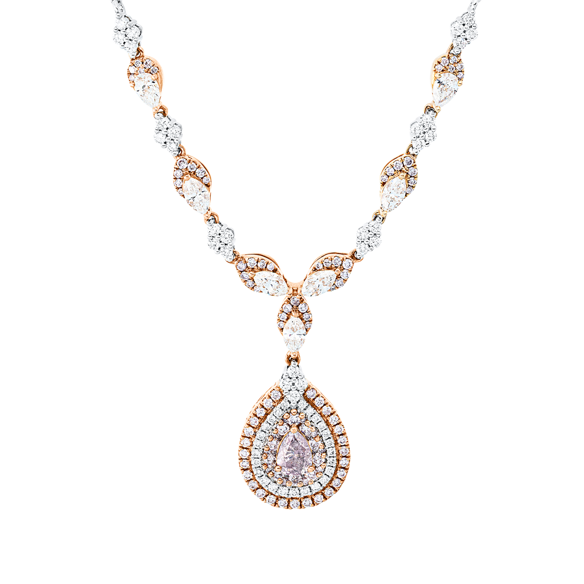 Collier 18 kt WG+RG, 5 Navette 0,69 ct, TW-vsi, 2 Tropfen 0,30 ct, TW-vsi, 61 Brillanten 0,74 ct, TW-si, 1 Tropfen 0,52 ct, pink, 100 Brillanten 0,71 ct, pink, H:40,8 mm, B:23,4 mm, L:40,6 cm, S:16,2 mm