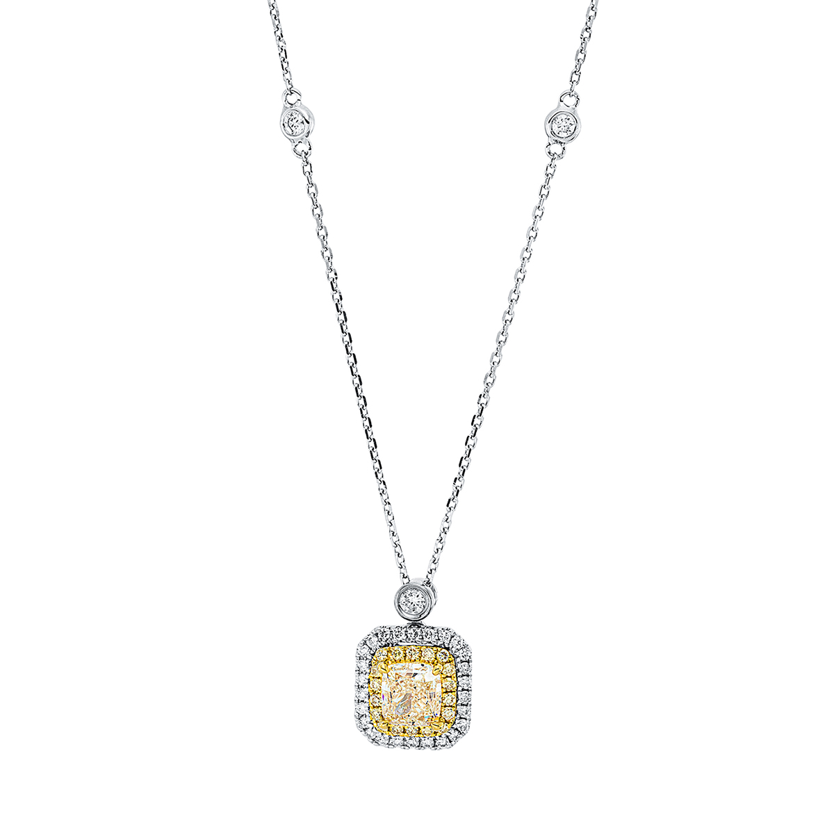 Collier 18 kt WG+GG, GIA6421181534, 1 Cushion 1,01 ct, gelb-vs2, 28 Brillanten 0,19 ct, TW-si, 19 Brillanten 0,15 ct, gelb, L:45,7 cm