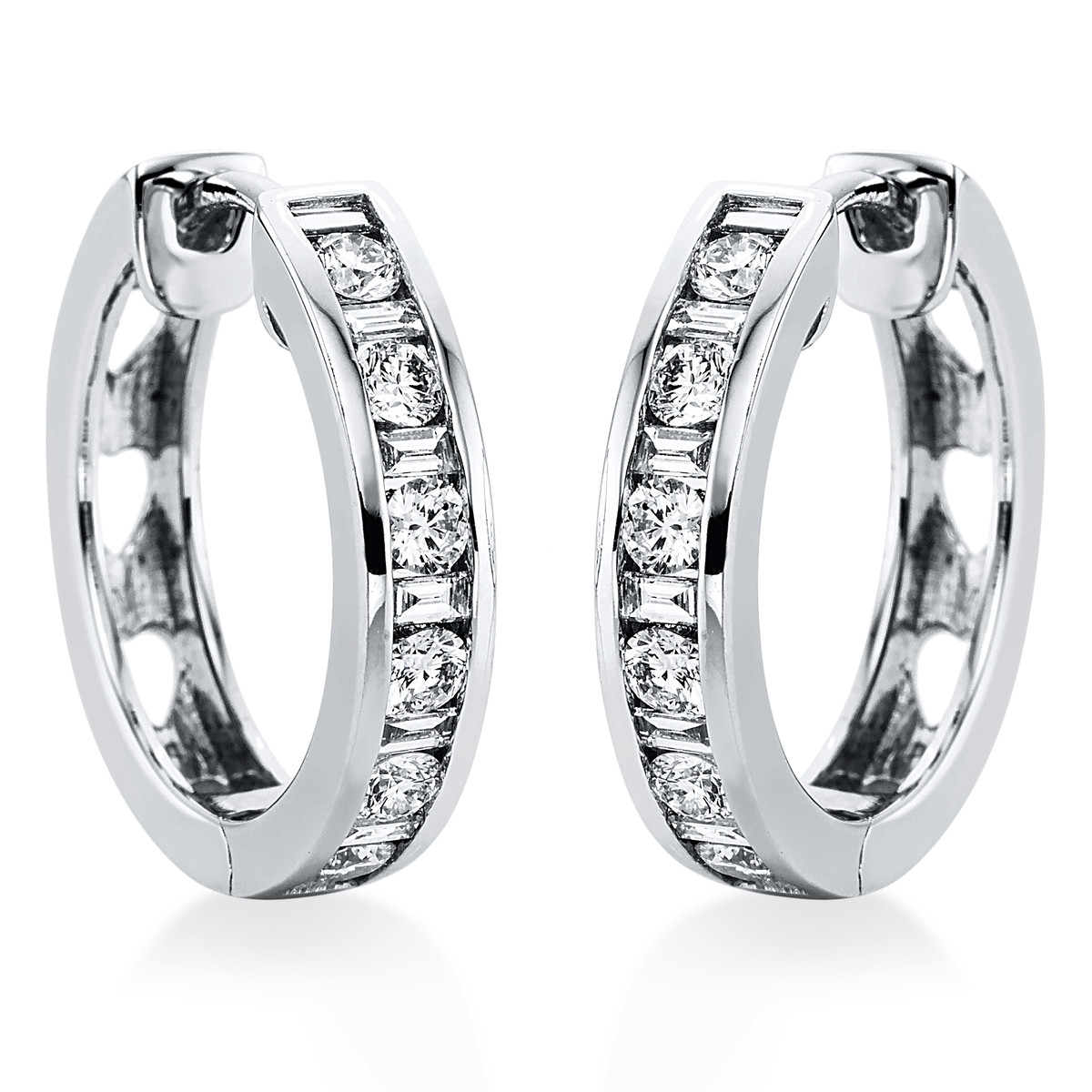 Creolen 18 kt GG, 14 Baguette 0,27 ct, TW-si, 12 Brillanten 0,55 ct, TW-si, H:18,0 mm, B:17,6 mm, S:2,3 mm