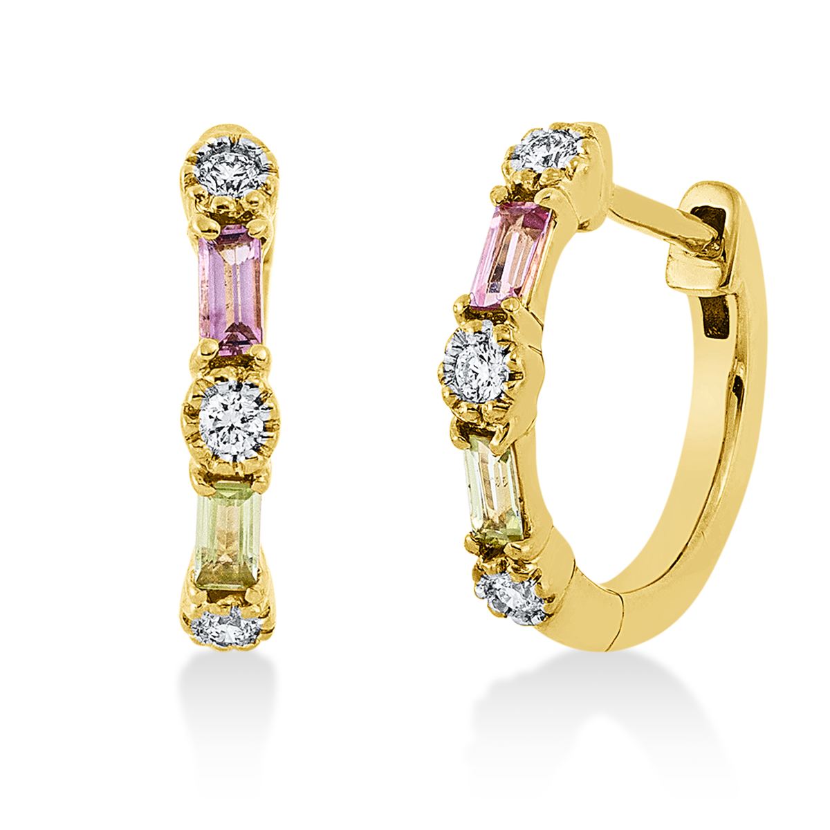 Creolen 18 kt GG, 6 Brillanten 0,08 ct, TW-si, 2 Turmalin 0,12 ct pink, 2 Peridot 0,12 ct grün, H:12,5 mm, B:14,4 mm, S:2,4 mm