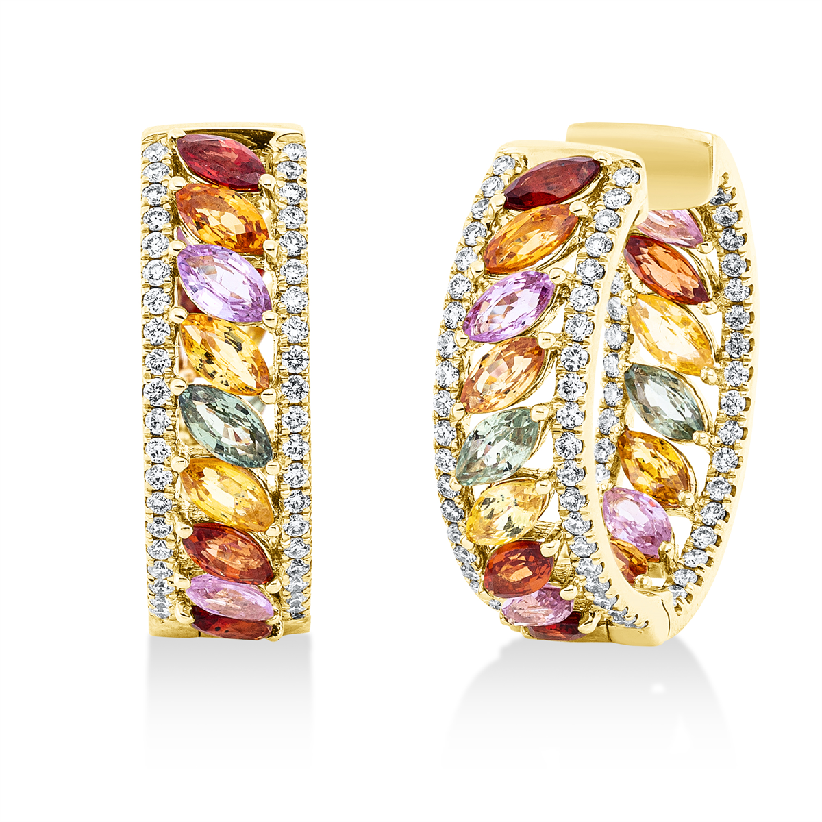 Creolen 18 kt GG, 160 Brillanten 0,99 ct, TW-si, 32 Saphire 5,25 ct fancy, H:22,2 mm, B:20,9 mm, S:7,1 mm
