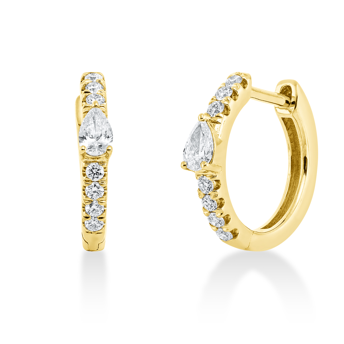 Creolen 18 kt GG, 2 Tropfen 0,15 ct, TW-vsi, 14 Brillanten 0,12 ct, TW-si, H:11,9 mm, B:13,3 mm, S:2,2 mm