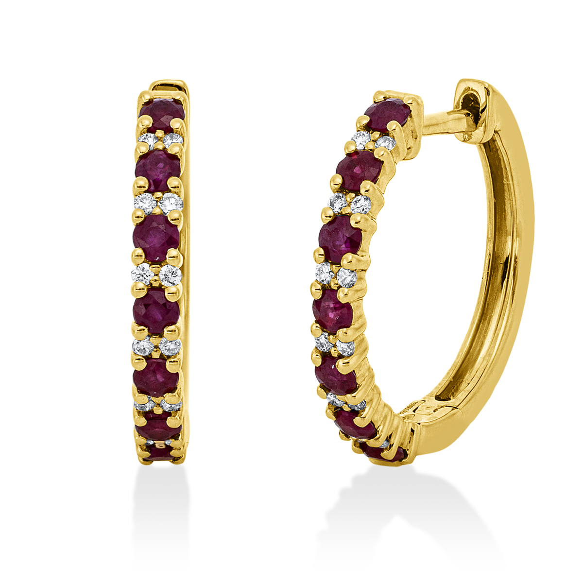 Creolen 18 kt GG, 24 Brillanten 0,07 ct, TW-si, 14 Rubine 0,45 ct rot, H:14,2 mm, B:16,0 mm, S:2,0 mm