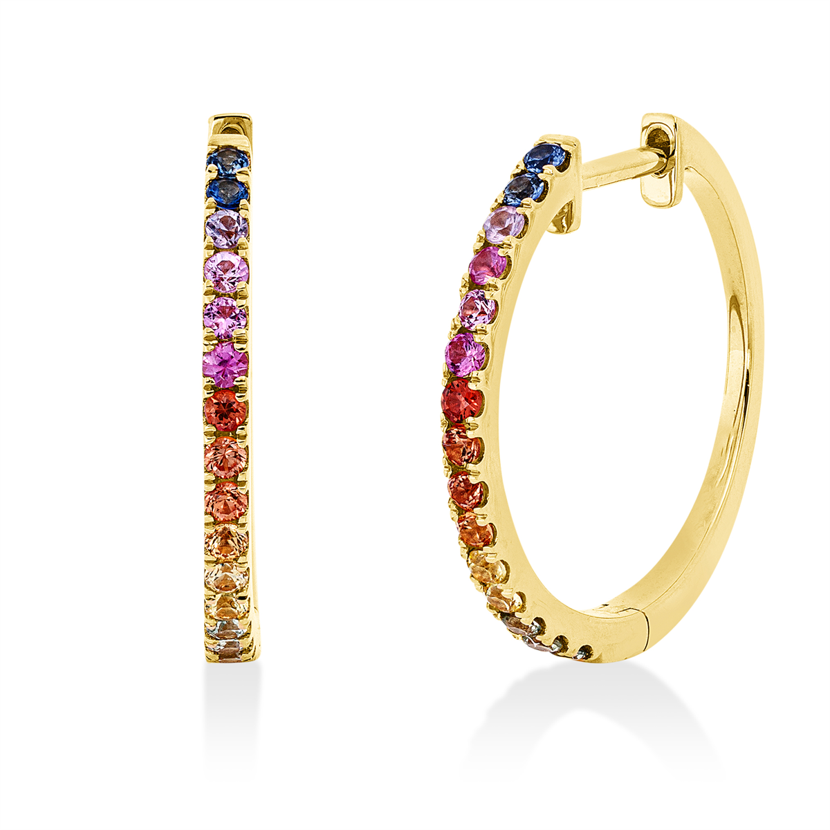 Creolen 18 kt GG, blue,pink,orange,yellow,green, 30 Saphire 0,58 ct fancy, H:19,4 mm, B:19,9 mm, S:1,7 mm