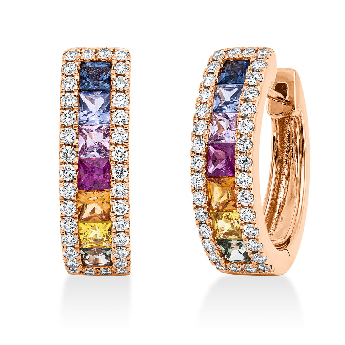 Creolen 18 kt RG, 68 Brillanten 0,60 ct, TW-si, 14 Saphire 1,95 ct multicolor, H:18,6 mm, B:15,1 mm, S:5,8 mm